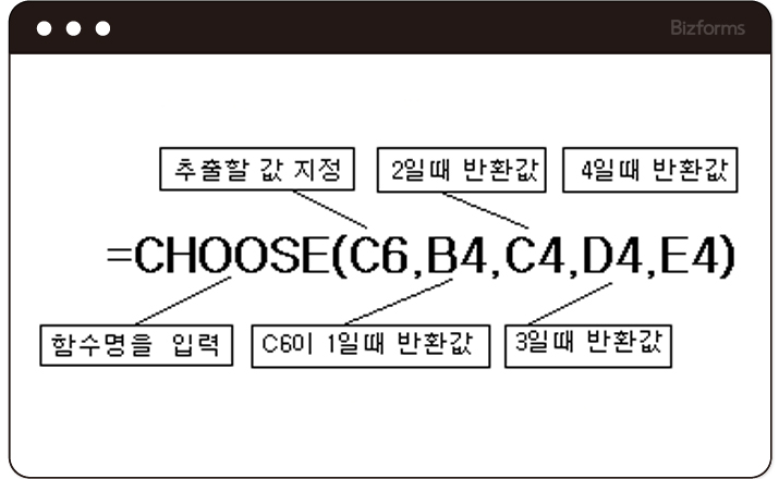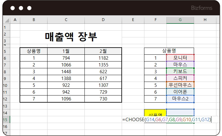 * CHOOSE Լ μ ߿ Ư μ ȸϴ ԼԴϴ. Լ μ 쿡 ؾ ϴ ϰ ˴ϴ. : =CHOOSE(Index_num, Value1, Value2, ...) : index_num(ε ȣ) - մϴ.value1, value2, ...- , ڿ, (,) Ͽ ִ 29 մϴ. CHOOSE Լ ̿Ͽ ǥ G14 ȣ Էϸ ش ǰ ڵ Է ǵ ҽϴ. ̶ ּҰ ƴ Էص ˴ϴ. =CHOOSE(C6,"͡,콺,Ű塰,Ŀ)